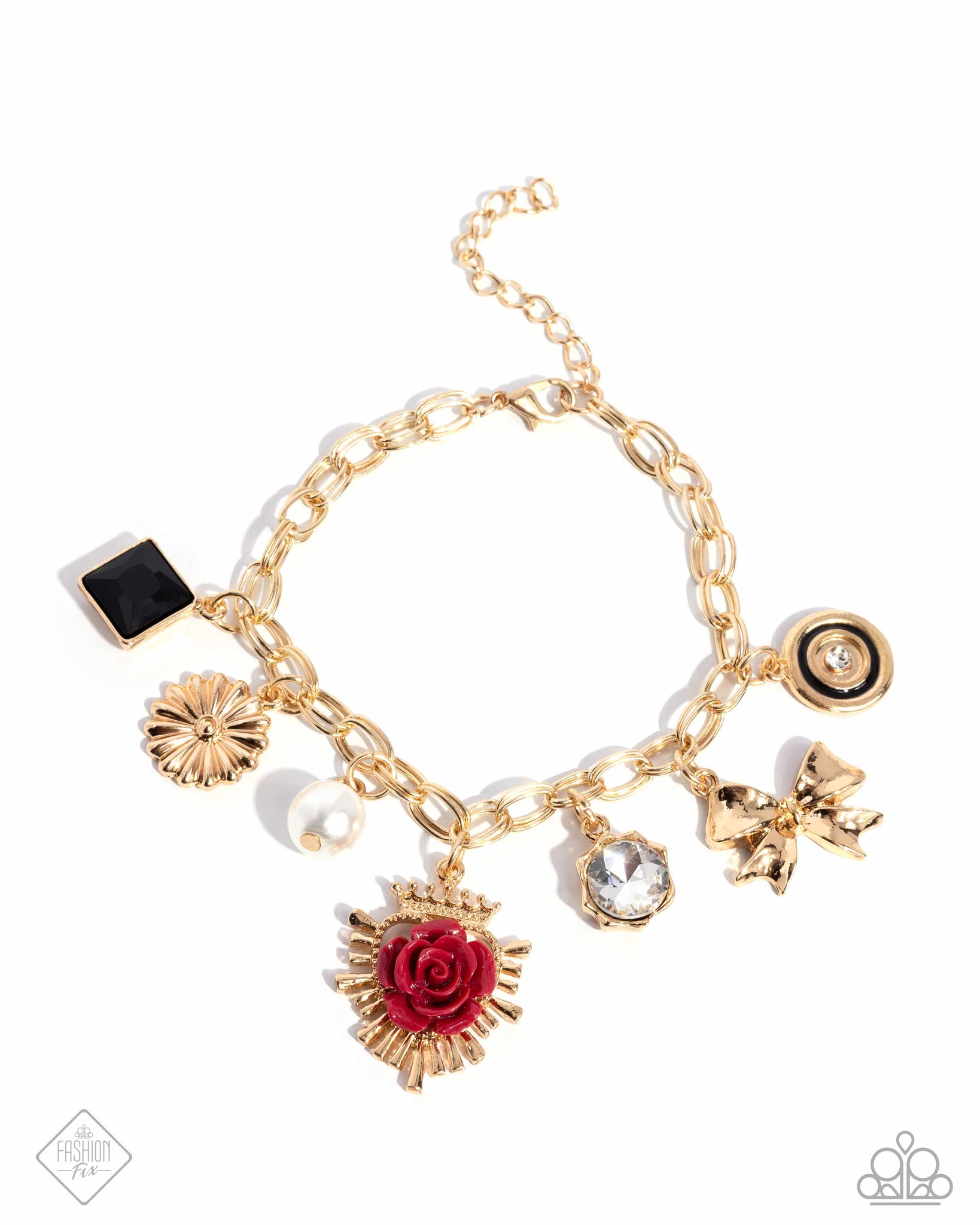Victorian Verdict Multi - Glistening gold cable chain links, lead around the wrist featuring a collection of haughty charms, including a textured gold flower, a wine acrylic rosette blooming atop a royal crown-inspired coat of arms sporadically dotted with white rhinestones, a square-cut black gem, a gold bow, a black-painted layered gold pendant with a white gem center, a white gem pressed in a spiky floral gold frame, and a polished, solitaire white pearl. Features an adjustable clasp closure.